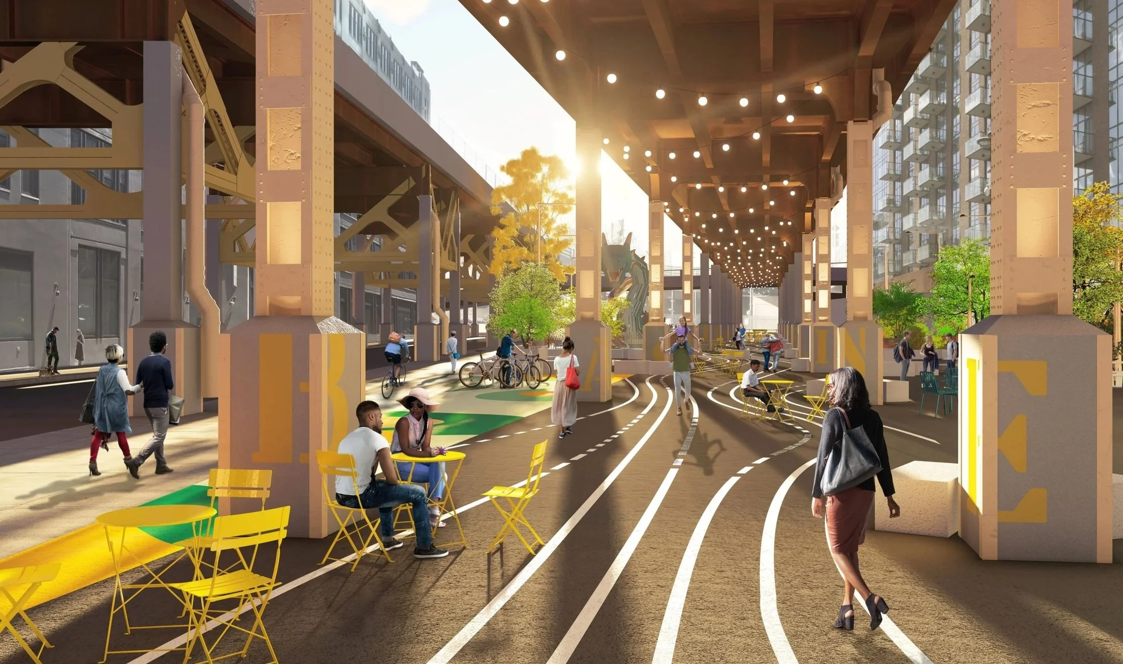 STUDIO V Design + Planning is converting a stretch of residual public land under two elevated bridges in Long Island City into public space featuring gardens and seating, an innovative children’s playground, a flexible arts and culture court, active spaces, picnic areas, and a dog run. The new public space will feature active, passive, and cultural uses - including seating, lighting, pedestrian paths, and a playground made of recycled materials inviting young children and families to explore and play. The space will also feature a flexible arts courtyard, surrounded by a sculptural green topiary facing the back of the Sculpture Center, a well-known cultural institution. This flexible art space for arts, sculpture, and performance will provide space for multiple local cultural groups. Outside the current site area, the design proposes improvements for Dutch Kills Street including street trees and boulders between ramps, outdoor restaurant seating, and a farmers’ market.